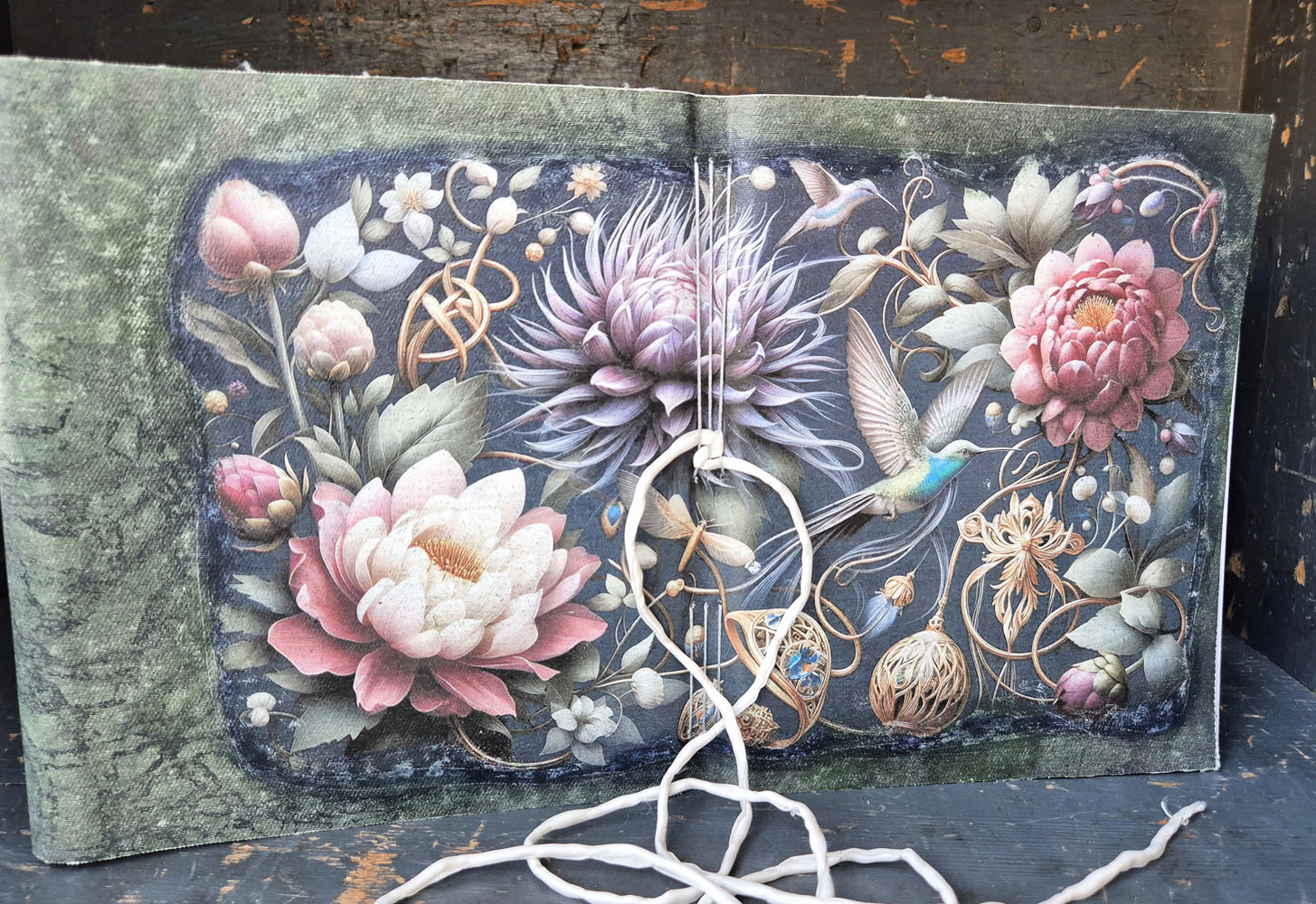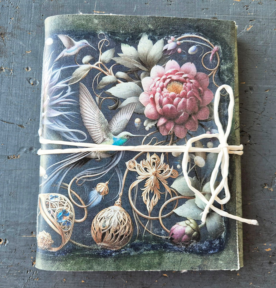 Der Buchumschlag ist länger gehalten und wird zum Schutz der Seiten eingeschlagen. Mit dabei ein Seidenband , das auch abgenommen werden kann.